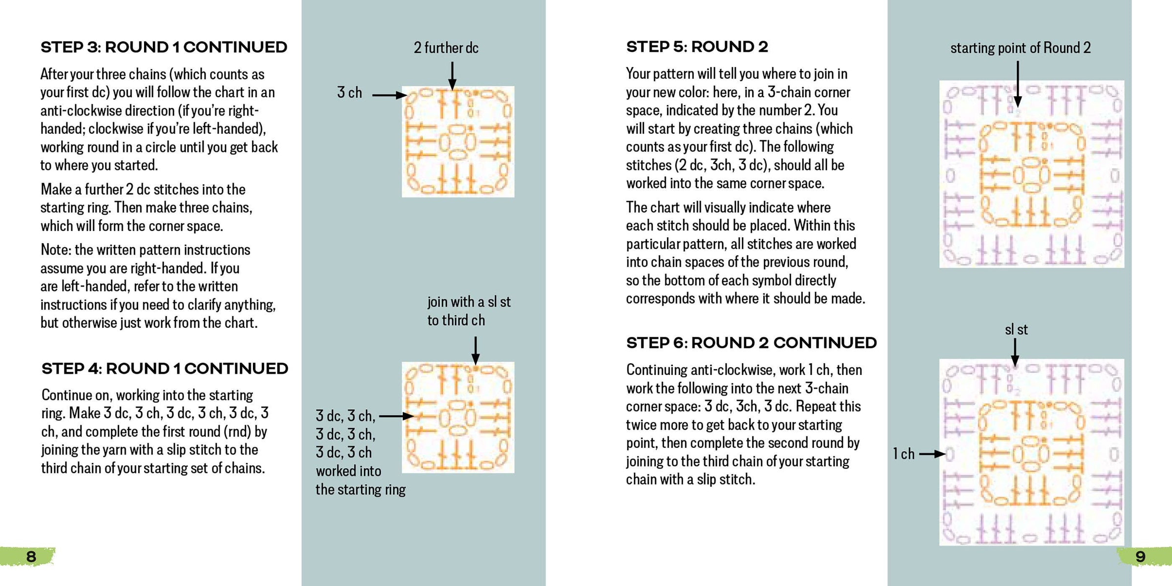 Also in the box is a 32-page booklet, which contains a comprehensive step-by-step guide to reading and understanding crochet charts, with five side-by-side examples of pattern and chart instructions to get you started. You'll also find advice on choosing yarns and hooks, two different methods for joining your squares together.