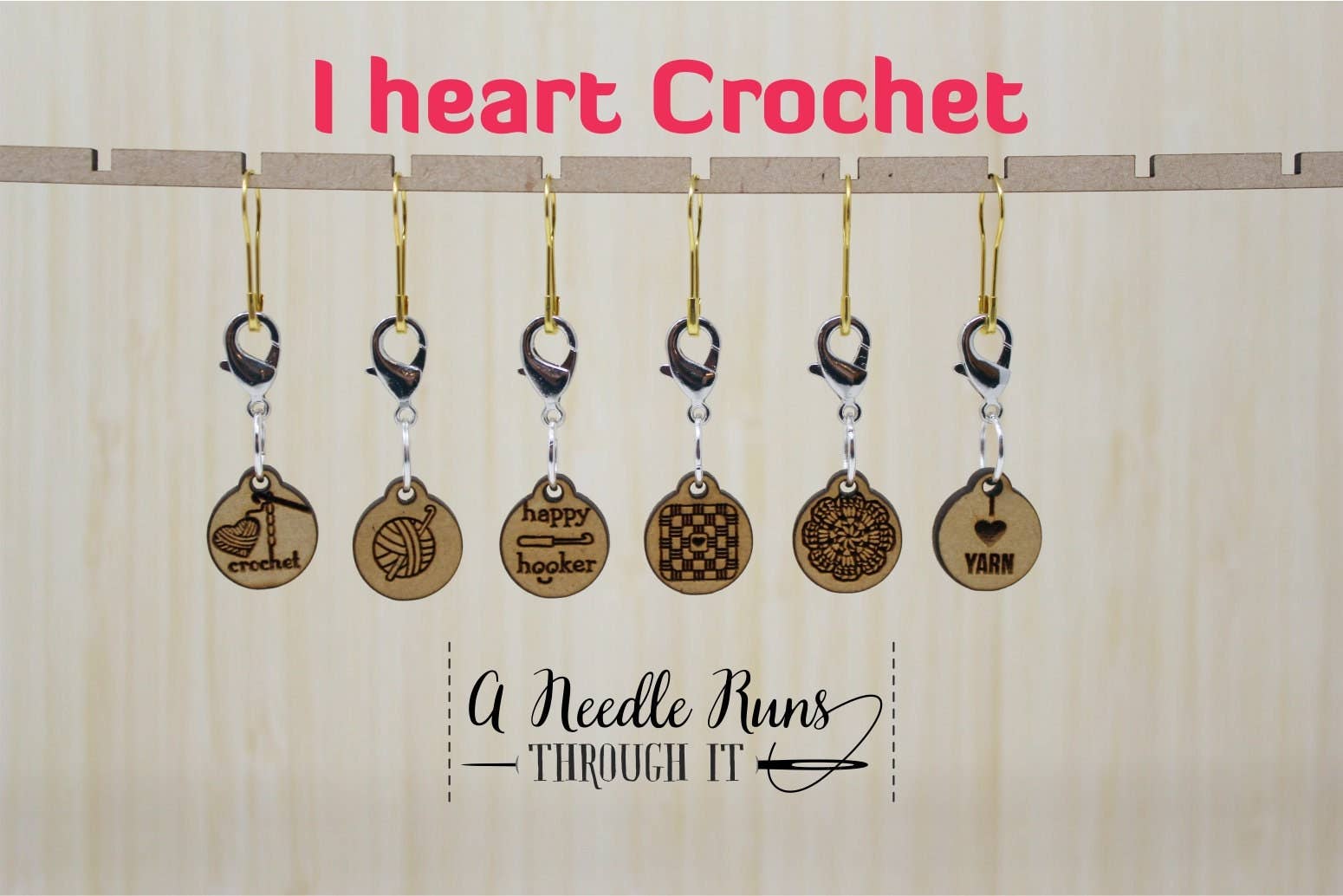 Set of 6 wood markers that include different designs for the crochet lover. Removable markers that can be used for knitting or crochet. These markers come with a 15mm clasp that opens easily to attach to your project. These charms and markers are lightweight, easy to use, and won't snag your work.