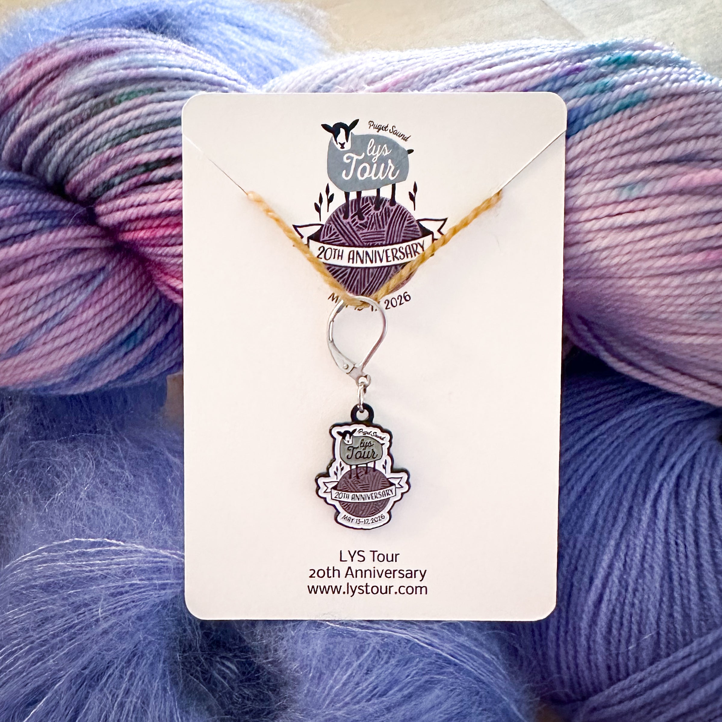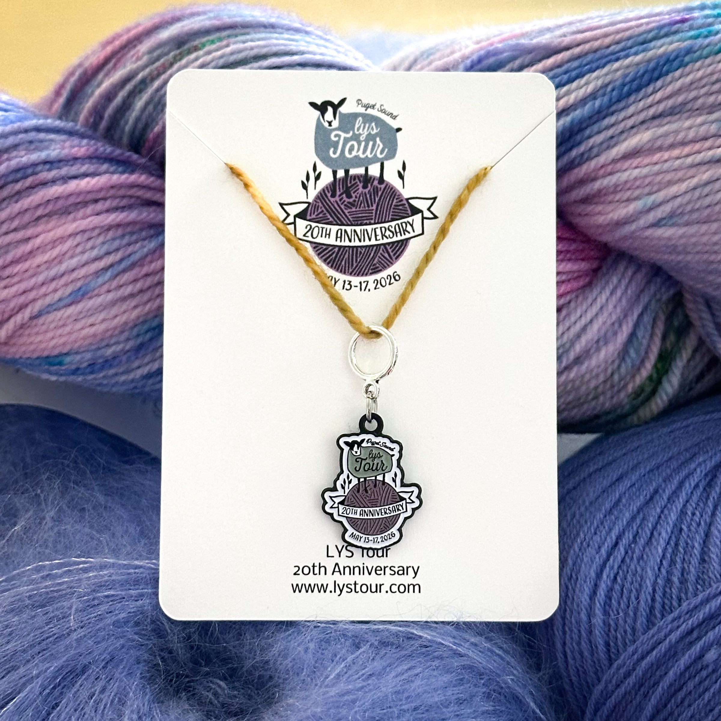 Celebrate 20 years of the Puget Sound LYS Tour with us with the 20th Anniversary LYS Tour Stitch Marker!